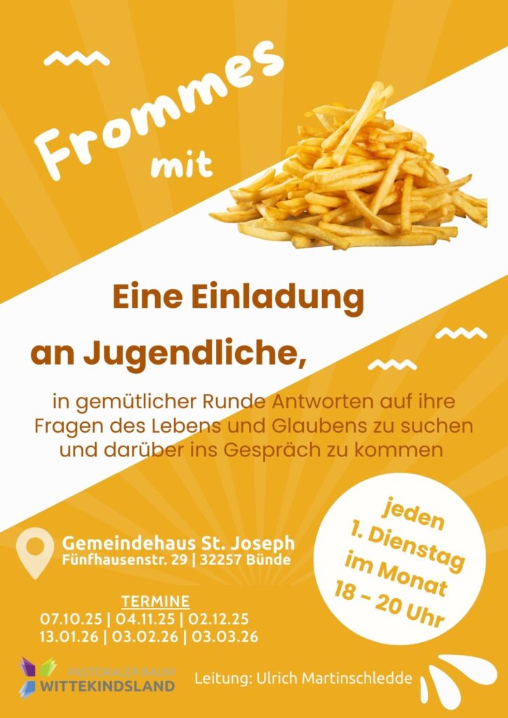 An jedem 1. Dienstag im Monat sind alle Jugendlichen, die in gemütlicher Runde Antworten auf Fragen des Lebens und Glaubens suchen, zu Frommes mit Pommes ins Gemeindehaus in Bünde eingeladen.Beginn ist um 18 Uhr. Eine Anmeldung ist nicht erforderlich. Für Fragen steht Ansprechpartner Ulrich Martinschledde zur Verfügung.