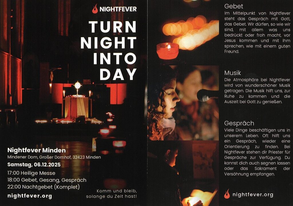 Am Vorabend des 2. Advent (06.12.) laden wir ganz herzlich zum Nightfever in den Mindener Dom ein. Beginn ist um 17.00 Uhr mit der Hl. Messe. Anschließend sind alle eingeladen, bei Gebet, Musik und Gespräch vor dem Allerheiligsten zu verweilen: Komm und bleib, solange du Zeit hast! Der Abend endet mit der Komplet, dem Nachtgebet der Kirche, um 22.00 Uhr.