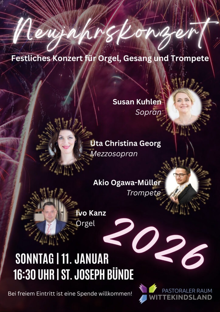 Kirchenmusiker Ivo Kanz lädt am Sonntag, 11. Januar 2026 um 16.30 Uhr nach Bünde in die Kirche St. Joseph zum, Neujahrskonzert ein. Gemeinsam mit den Sängerinnen Susan Kuhlen (Sopran) und Uta Christina Georg (Mezzosopran) sowie Trompeter Akio Ogawa-Müller hat er ein abwechselungs- und schwungreiches Programm vorbereitet.