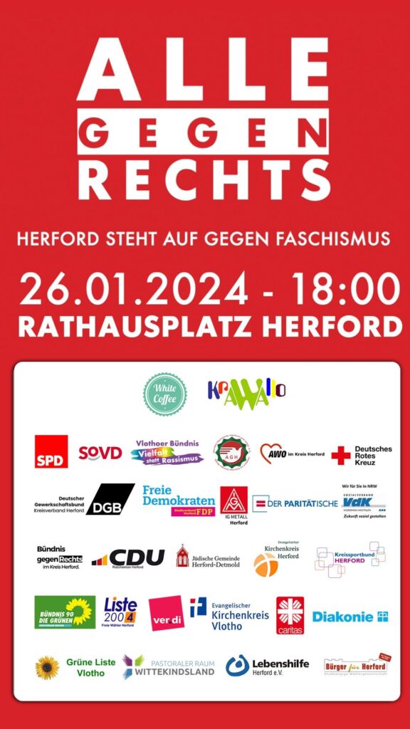 Die Kundgebung in Herford, getragen und unterstützt durch ein breites zivilgesellschaftliches Bündnis, findet statt am Freitag, den 26. Januar 2024, ab 18:00 Uhr auf dem Rathausplatz.